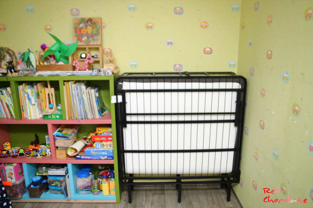 침대를 사용하지 않을 때나 방 공간을 넓게 사용할 때는 이렇게 간단히 접어두어도 된다는 장점이 있다.