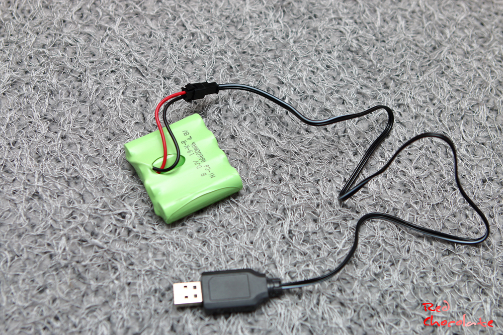 4.8V 충전식 배터리팩과 USB 충전기가 있다.