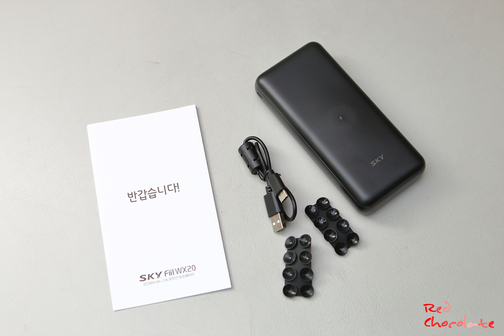구성은 스카이 필 WX20 본체, C-타입 충전 케이블, 흡착판 2개, 사용설명서 이렇게 간단히 구성되어 있다.