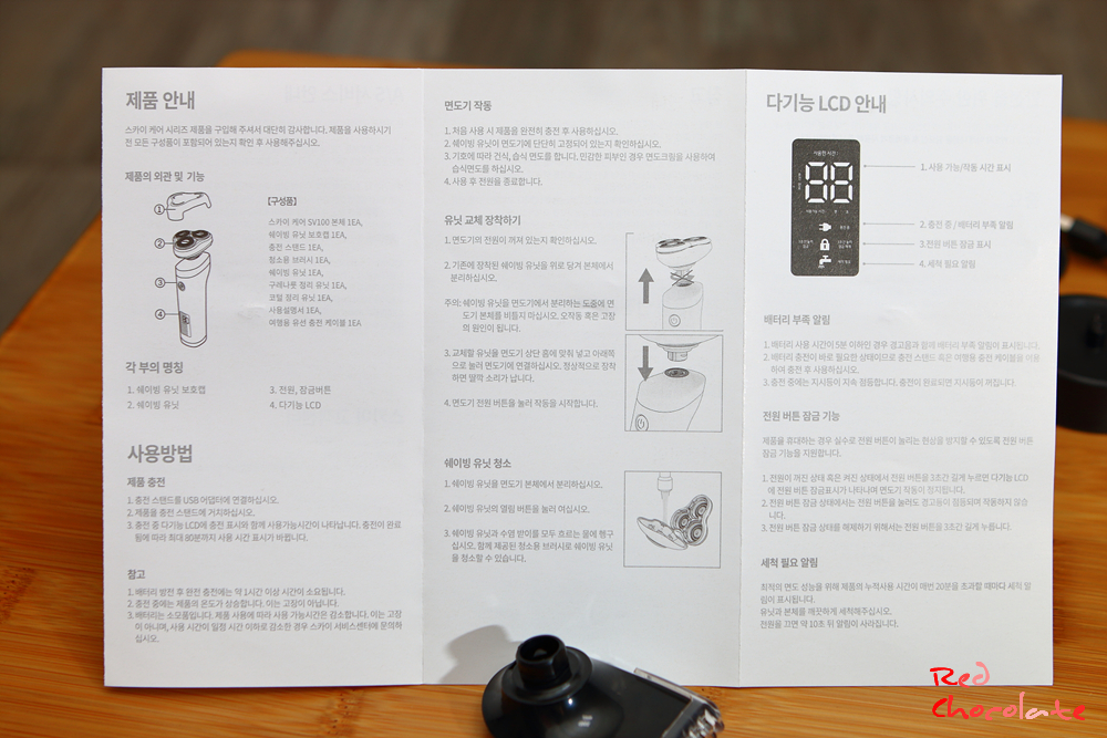 사용 설명서에는 스카이 케어 SV100 전기면도기 사용법은 물론 트리머 교체방법, 트리머 청소, 디스플레이 인디케이터 안내 등 사용 방법과 주의할 점까지 세밀히 적혀있다. 사용 전 꼭 확인해야겠다.