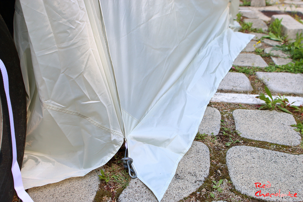 그리고 중앙 부분에 있는 또 다른 스트랩은 차량 측면에 헐렁하거나 바람에 펄럭일 경우를 대비해 뒷문 손잡이에 걸 수 있도록 추가로 부착되어 있다. 이 또한 스타렉스에 경우 바람이 세게 불지 않는 한 당길 필요가 없었으며 고정할 손잡이가 없기에 무용지물이었다. 하지만 SUV 차량에선 아주 쓸모가 많아 보였다. 캠프밸리 카쉘터나 기존 돔캐노피 카커넥터의 경우 들뜸 현상이 많은 측면에 한 번 더 고정할 수 있어 아주 마음에 들었다. 바람이 많이 부는 날엔 스벅이에 장착할 때 역시 어디든 고정을 해야겠다.