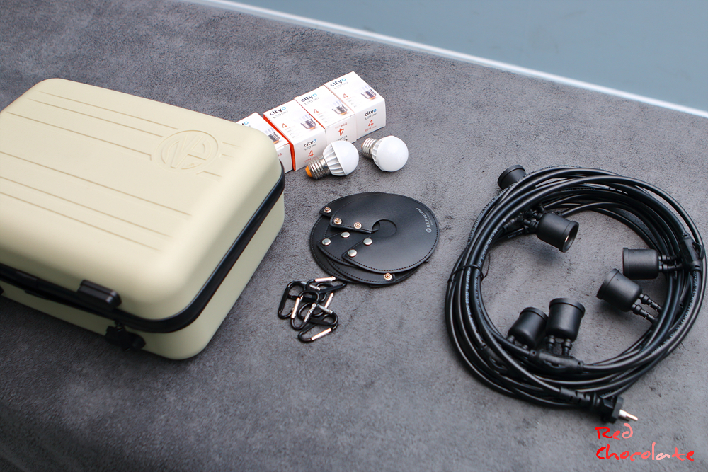 NIP 파티라이트 풀세트 구성은 6구 전선, 전구, 쉐이드, 미니비너, 전용가방 이렇게 전용가방 속에 모두 담긴다.