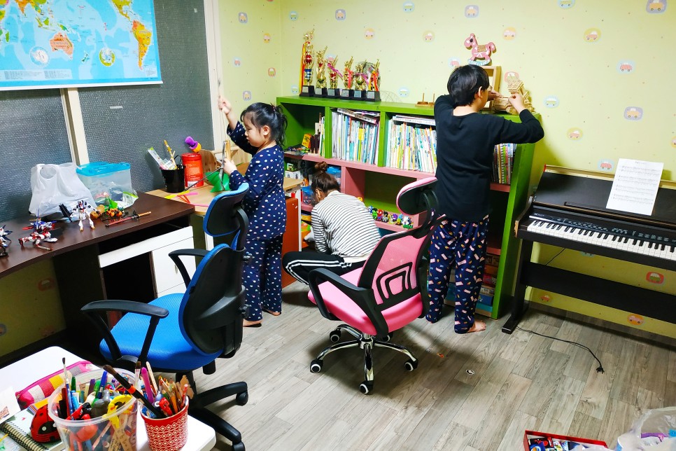 우선 집에 있는 책상 다 아이들 방에 옮기고 옷장과 다른 책장 모두 안방과 거실로 다 끄집어낸다...
