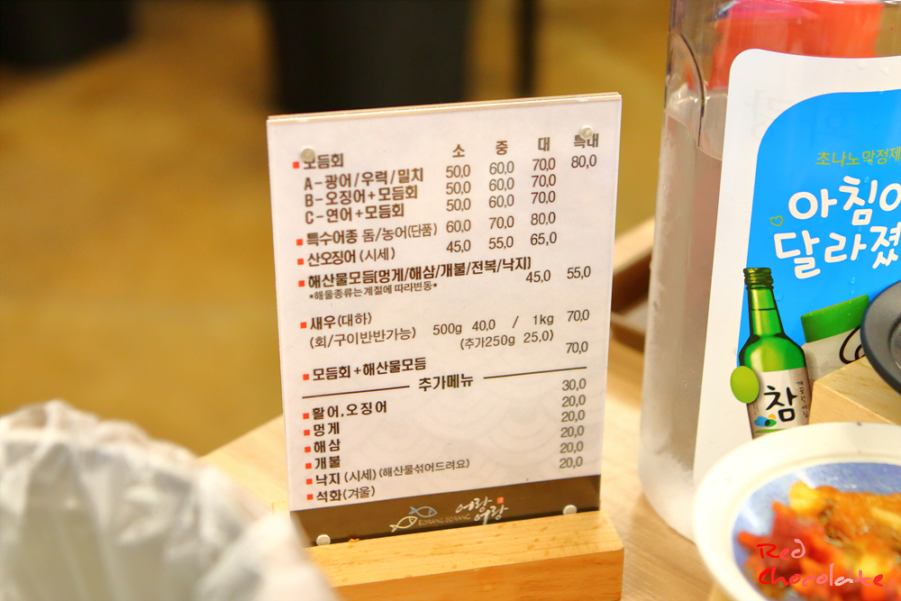 원래 모듬회 + 산오징어 먹을려고 했는데 지금 4월은 오징어 금어기라 산오징어회는 없다고 하신다.
