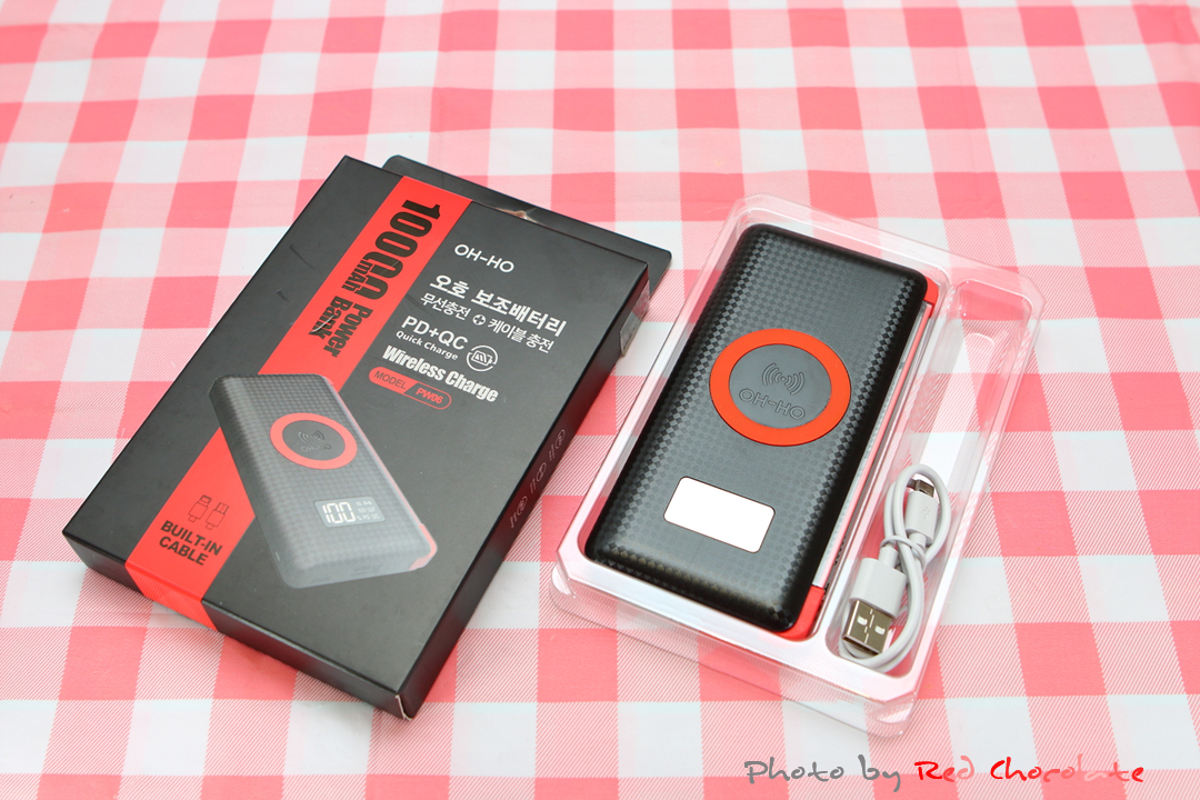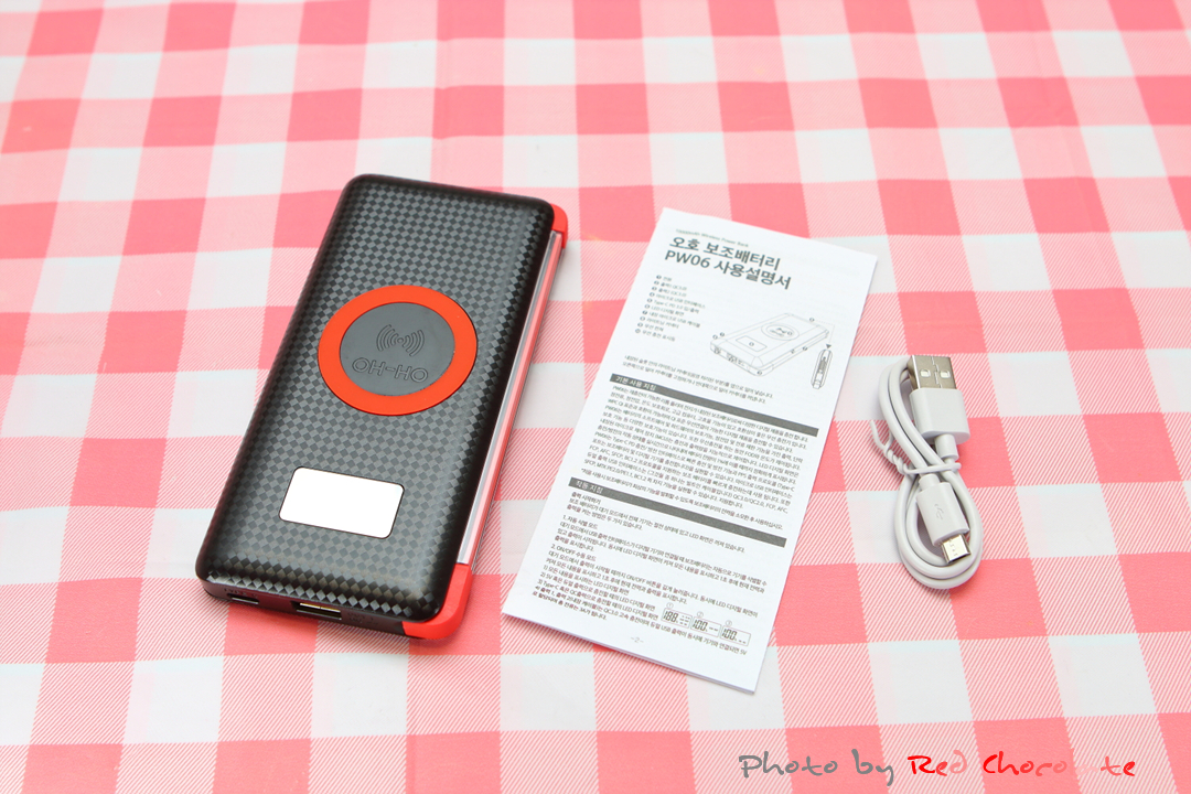 구성품으로는 보조배터리 오호 PW06 본체와 설명서, 충전 케이블....
