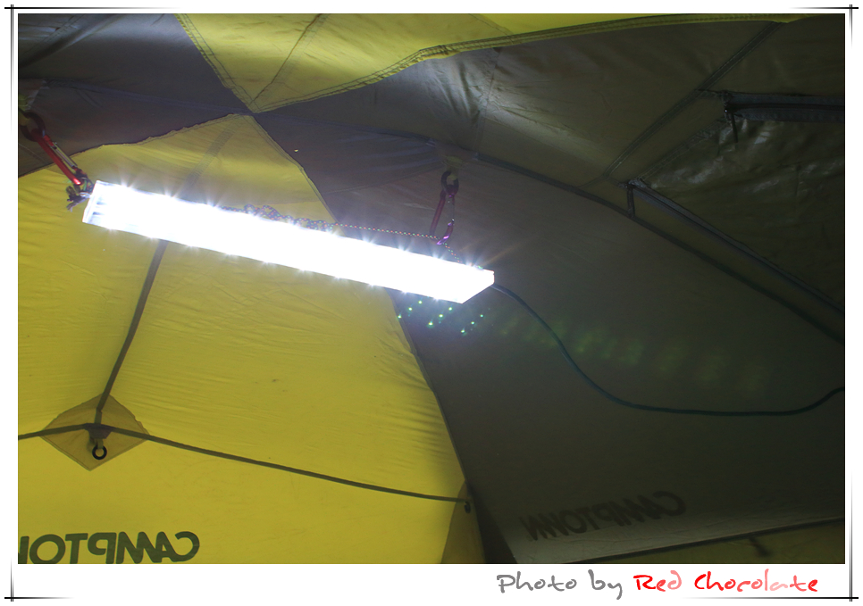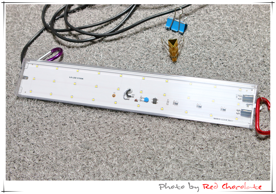 구조는 간단하다... 요즘 가정용 거실등, 방등, 주방등에 들어가던 55W, 36W FPL 램프 대용으로 사용하는 LED DIY 제품에 미리 준비한 220V 삽입 코드가 있는 전선에 연결하기만 하면 되는 것이다...^^ 그리고 텐트 천장에 걸 수 있는 스트랩이나 비너를 장착하면 끝...