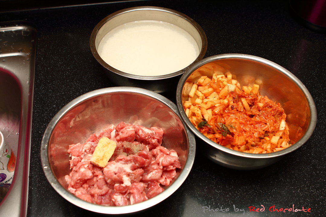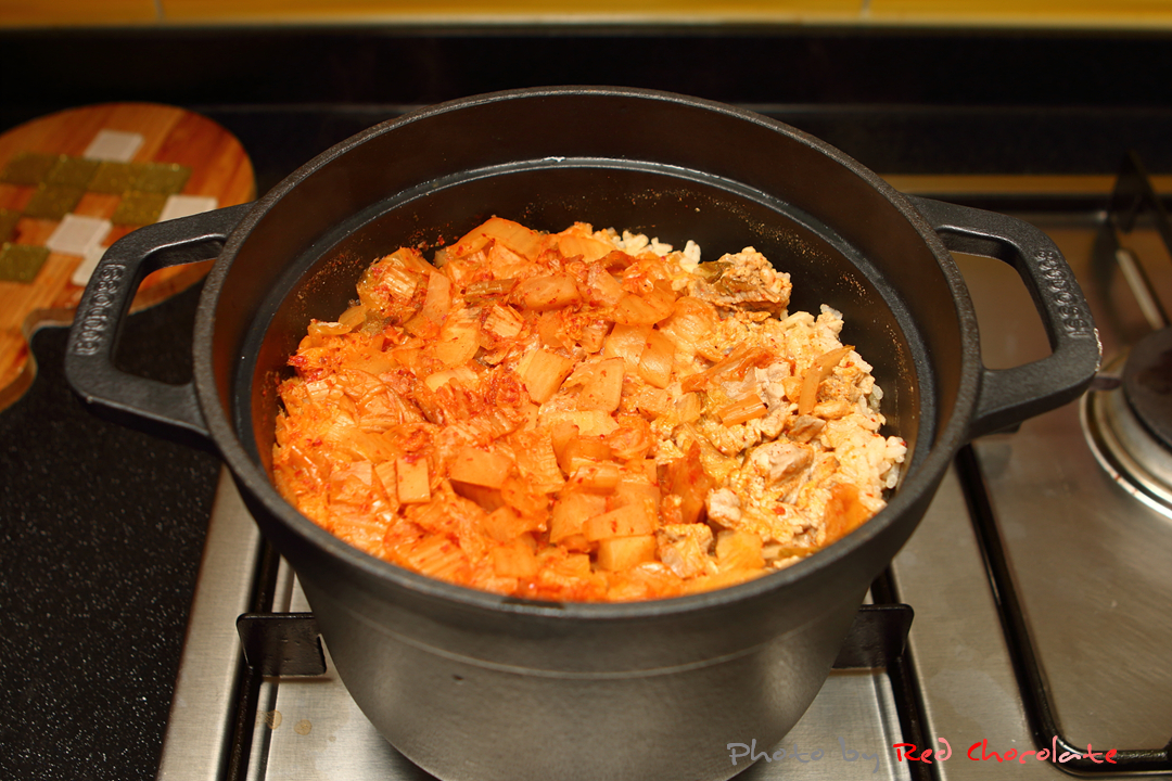 쌀을 불리기도 했거니와 김치와 김치국물이 들어갈 거라서 밥물은 평소보다 더 적게...