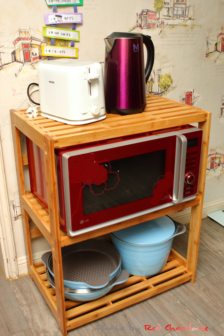 가장 위 선반에는 필요할 시 밥솥까지 올리려고 전자렌지를 가운데 넣은 것...