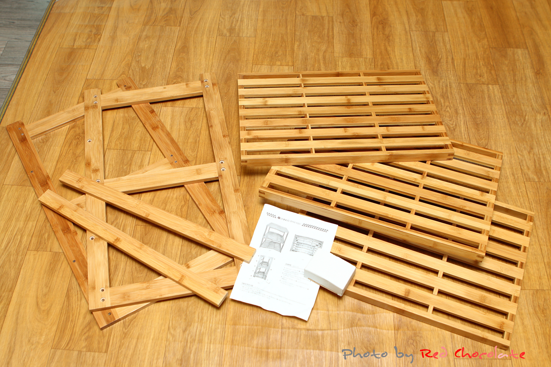 구성품은 좌우 다리 2개, 선반 상판 3개, 다리 고정 연결목 2개, 나사, 조립 설명서 이렇게 단순한 구성이다...