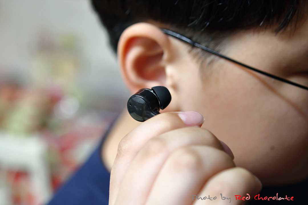 이어버드의 이어팁이 앞을 향하도록 좌우를 맞추고 끼우면 고무 이어팁 덕분인지 쉽게 빠지지는 않는다...