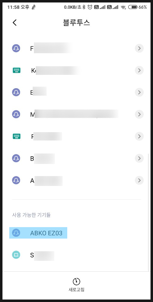 페어링은 전원이 ON 되면 자동으로 시도되는데 이때 디바이스에 ABKO EZ03이 검색되면 클릭해서 연결을 시도한다...