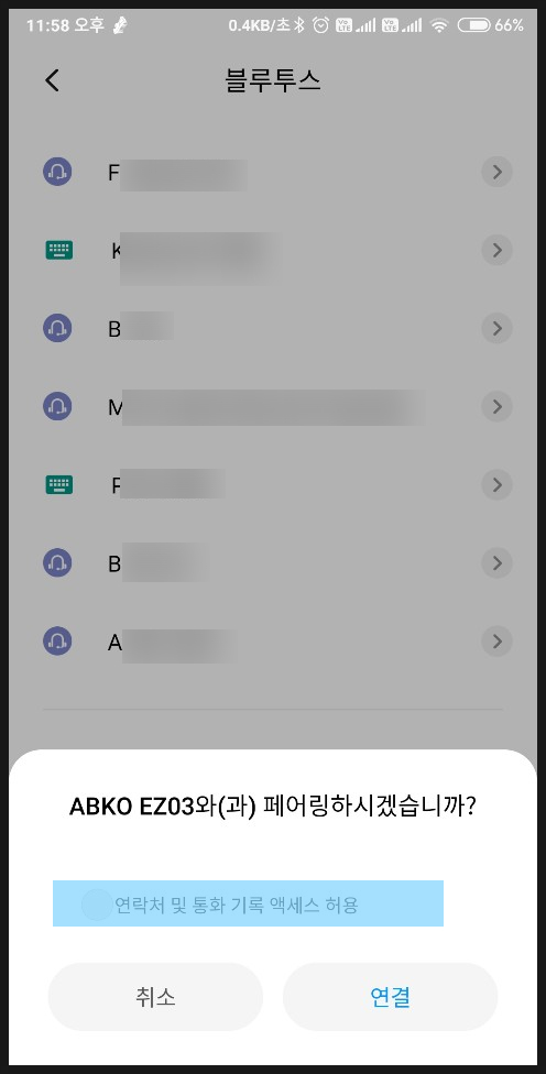 ABKO EZ03과 페어링하시겠습니까? 질문에 연결을 누르면 바로 연결...