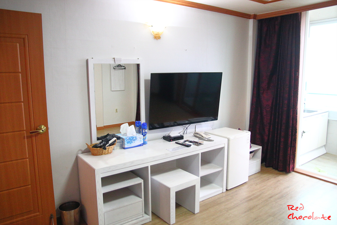 방 크기에 살짝 오버스러운 큰 티비가 있으며 기본적으로 드라이기, 빗, 와이파이, 소형 냉장고 등이 구비되어 있다.
