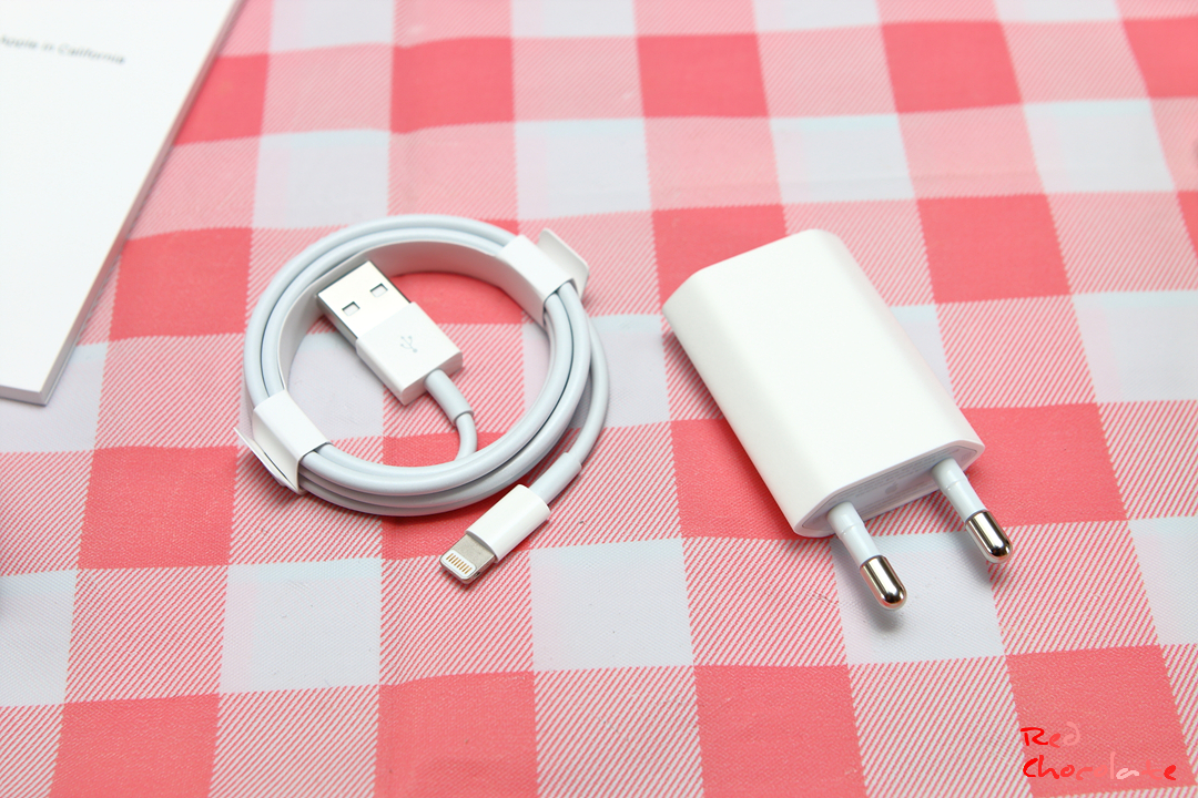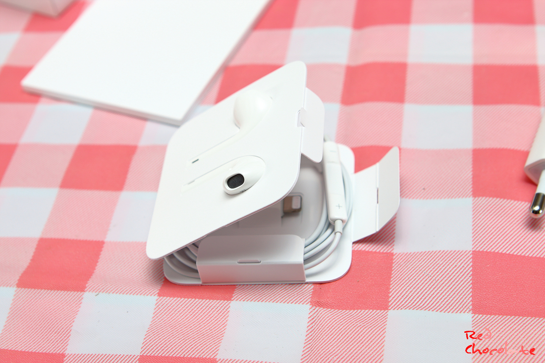 아이폰 SE 꺼내니 유선 이어폰과 충전기, 충전 케이블이 있다.