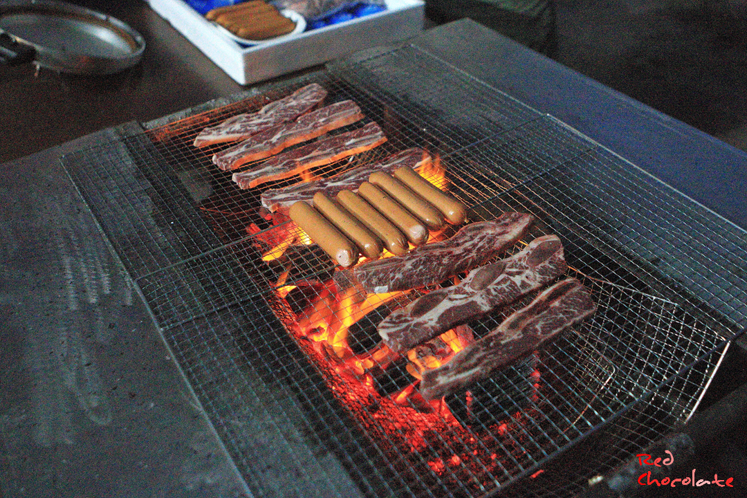 재촉하는 아이들 성화에 화로 가득 숯불을 피우고 소고기 파티 준비 완료...^^