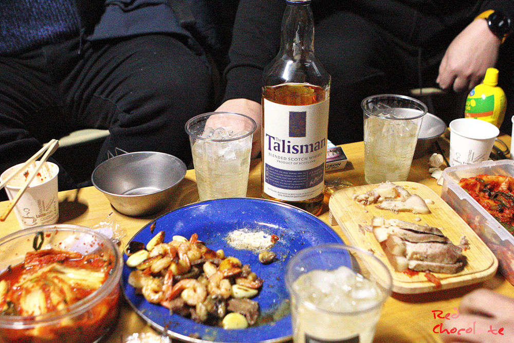 지난번 마트 갔을 때 캠핑 가 소주 좀 덜 먹어볼 요량으로 사두었던 이마트 가성비 위스키 탈리스만.